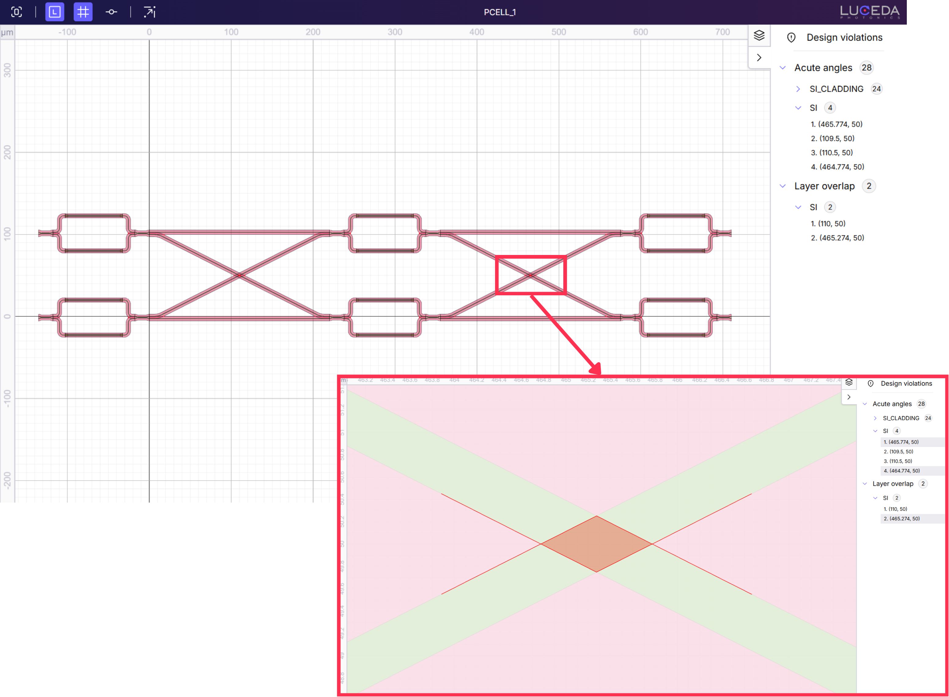 This opens your layout and highlights detected design violations, namely acute angles and layer overlaps.